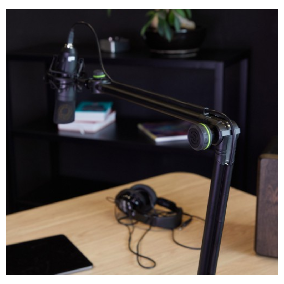 The GMSTBA01 offers a wide clamping range, fitting table edges up to 54 mm thick and attaching to smooth surfaces or pipes. Its three joints allow for precise placement in various orientations. The one-hand rotation feature lets you adjust the microphone holder in 90° increments effortlessly. The integrated cable guide ensures neat and accessible cable management.